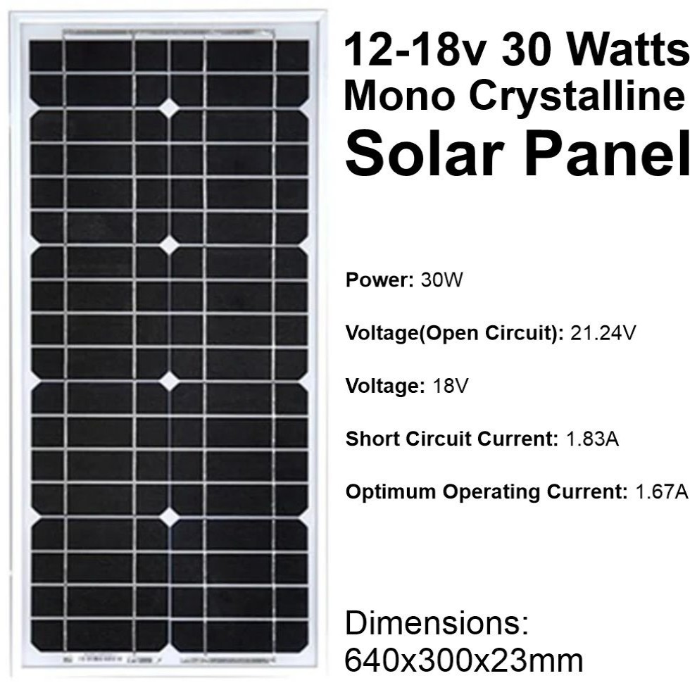 The SP-12V-30 is a 30 Watt, 12 Volt solar panel, and will provide enough power to trickle charge a 12V vehicle or deep cycle battery. Helps run pumps, lights, fans, and small appliances such as stereos, televisions and VCRs in caravans, boats or cabins. A heavy-duty anodized aluminium frame provides strength and convenient mounting access. Cells are laminated between high transmissivity, low-iron, 3mm tempered glass and sheet of tedlar-polyeaster-tedlar (TPT) material by two sheets of ethylene Vinyl acetate (EVA). This protects against moisture penetrating into the module. |