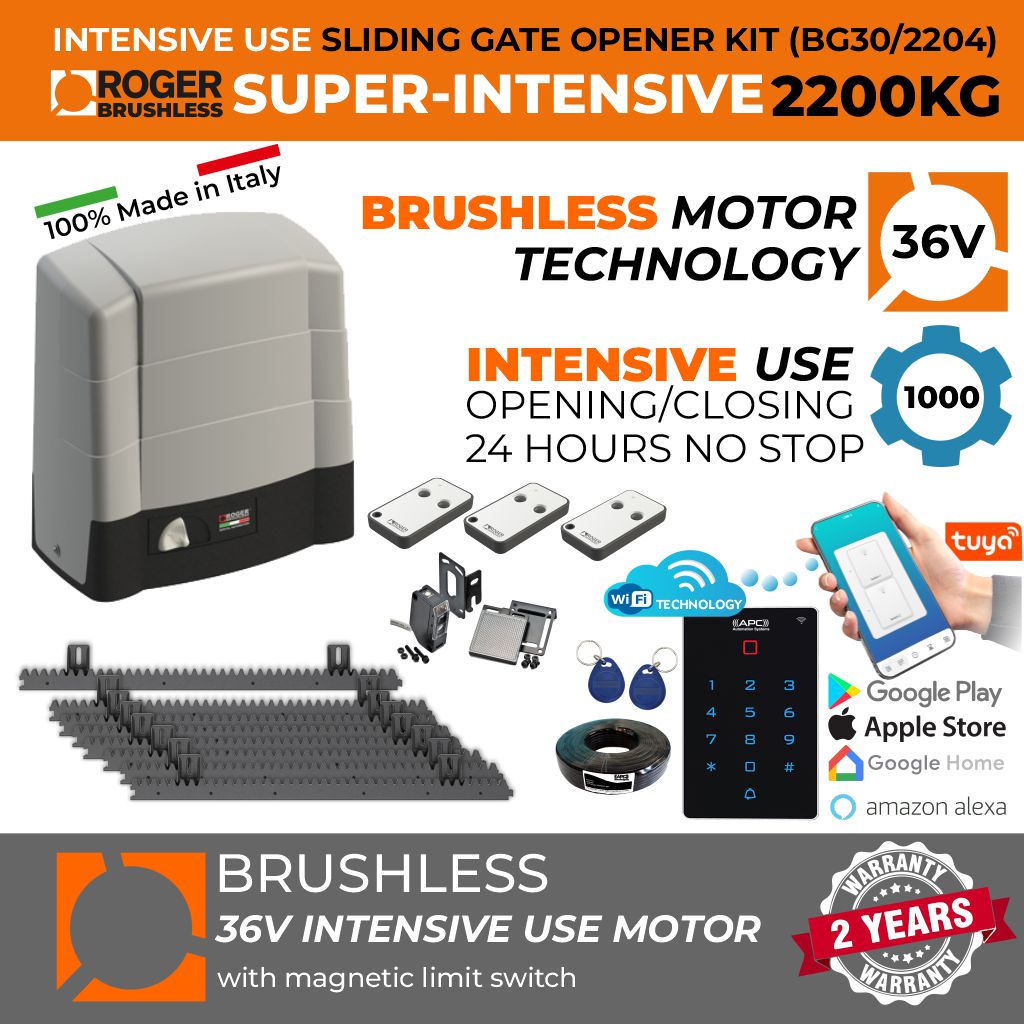 The Roger Technology BG30/2204 Brushless complete kit includes the roller sliding gate motor, control panel, and receiver.