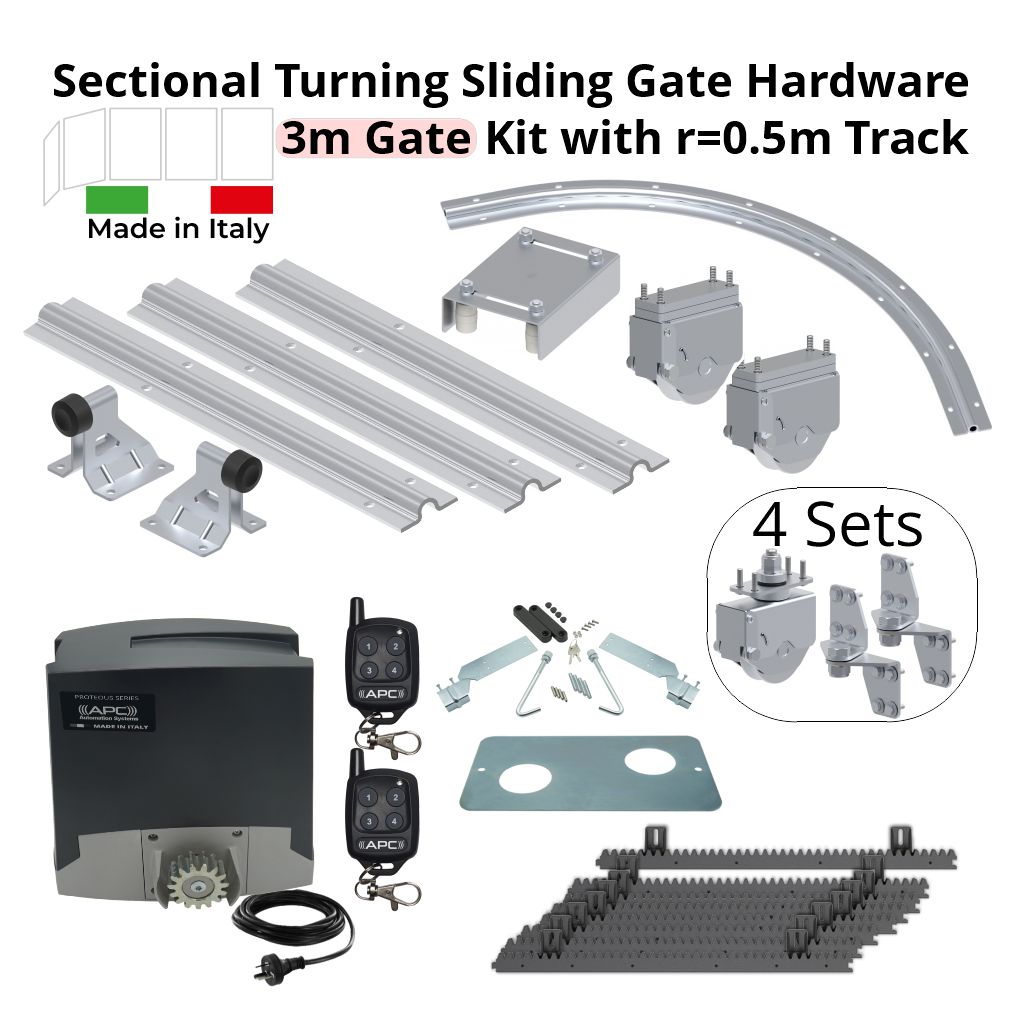 Provide convenience, security, durability, and an aesthetically pleasing solution for your property's entrance. Sectional turning sliding gate hardware kits (Gate-Panels Around The Corner Design) are made in Italy with high-quality, heavily galvanized steel.