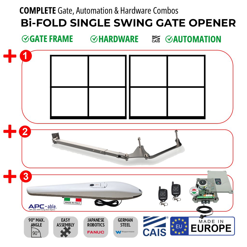 They need a special frame, so a few factors need to be considered, such as cross-bracing. The reason why cross-bracing is fundamental is primarily to keep the leaf from sagging. A compression cross-brace transfers weight from the top bar by pushing down against the bottom hinge or a vertical component or post, which transfers the load to both hinges. Improper or missing cross-bracing will cause the Vertical deflection of the leaf. Cross-bracing should always “lean into opening”. Furthermore, the bi-folding swing gate only works properly when the internal hinges are properly welded concerning the vertical axle. You‘ll also need to consider the wiring of safety edges, as this feature should be accommodated in the frame.