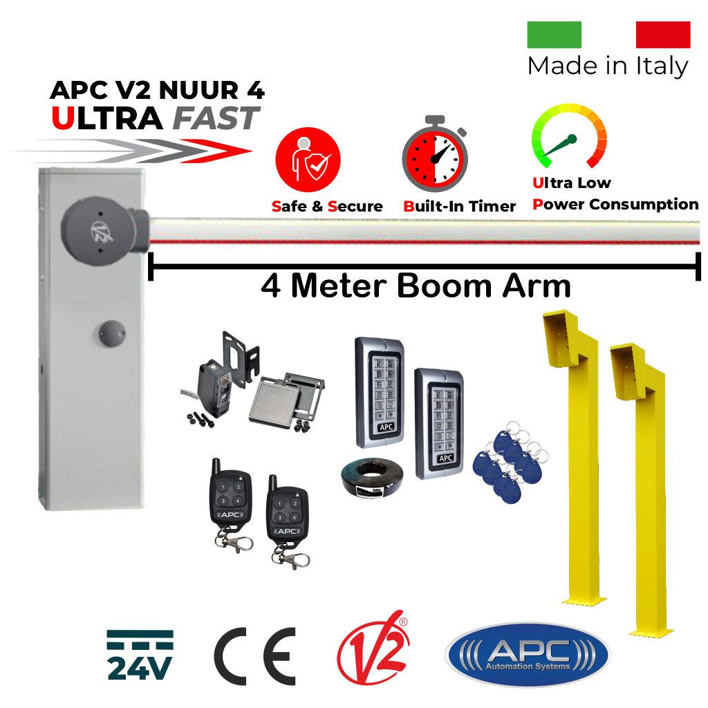 Boom Barrier / Boom Gate / Parking Barrier, Car Parking Access Control APC V2 NUUR4, Universal Boom Gate Ultra High-Speed 24V DC, 4 Meter Barrier Made in Italy