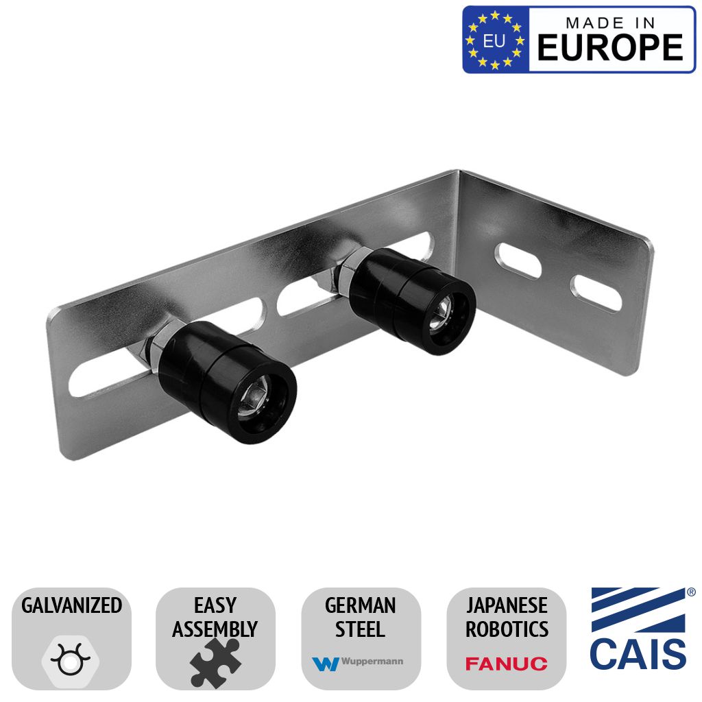 40mm x 30mm Rollers & Bracket. Suitable as a guiding system for manual or automatic sliding gates. The bracket supplied can be mounted on walls, pillars, posts, and other supports to withstand the load.
