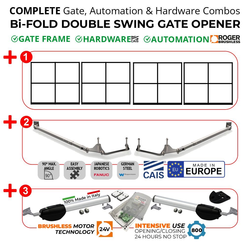 They need a special frame, so a few factors need to be considered, such as cross-bracing. The reason why cross-bracing is fundamental is primarily to keep the leaf from sagging. A compression cross-brace transfers weight from the top bar by pushing down against the bottom hinge or a vertical component or post, which transfers the load to both hinges. Improper or missing cross-bracing will cause the Vertical deflection of the leaf. Cross-bracing should always “lean into opening”. Furthermore, the bi-folding swing gate only works properly when the internal hinges are properly welded concerning the vertical axle. You‘ll also need to consider the wiring of safety edges, as this feature should be accommodated in the frame.