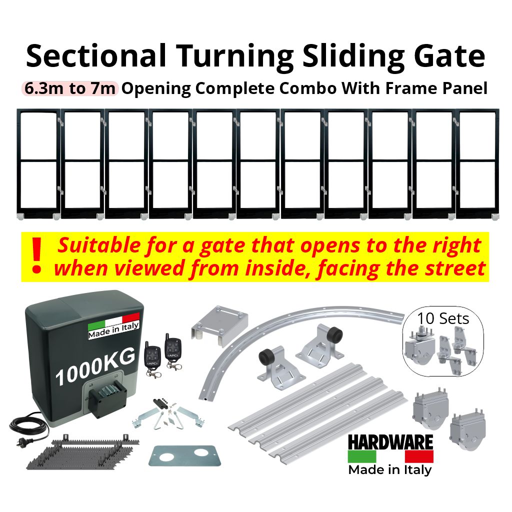 Provide convenience, security, durability, and an aesthetically pleasing solution for your property's entrance. Sectional turning sliding gate hardware kits (Gate-Panels Around The Corner Design) are made in Italy with high-quality, heavily galvanized steel.