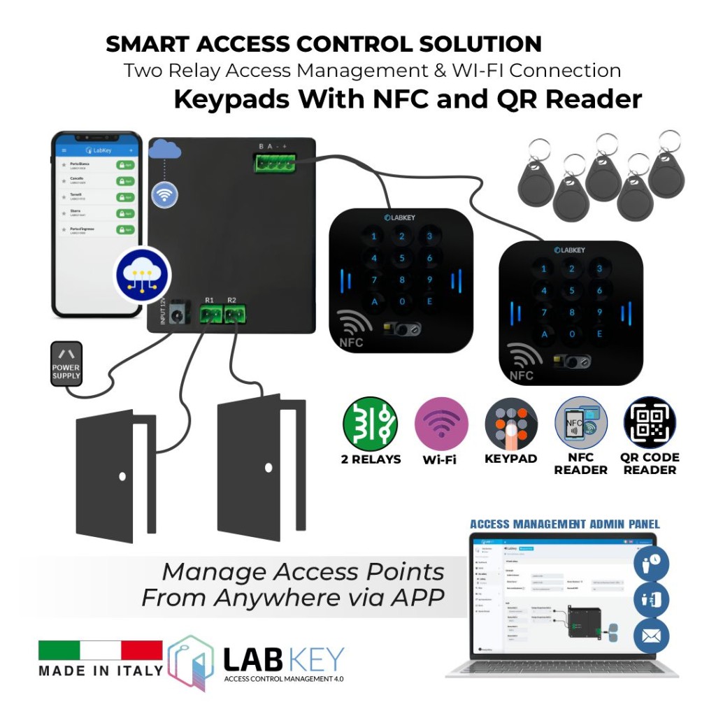 LabKey WiFi - 2 Relays | Paired with two LabKey Keypad + NFC Reader + QR Code Scanner, complete advanced access control