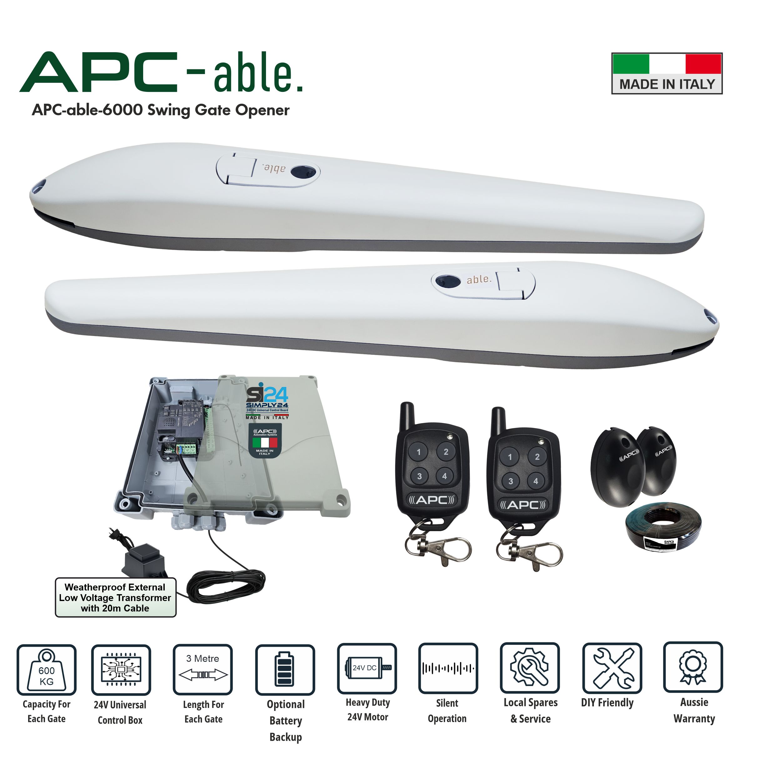 24V Automatic Double Swing Gate Motor. "APC Able 6000" Electromechanical actuator for swing gates with each leaf up to 3m in length (for each gate).