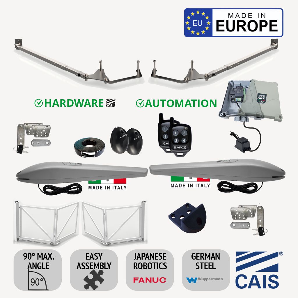 A traditional type swing-gate use up to 100% more backspace in its opening and closing if compared with bi-folding swing gates. Meaning that the standard space taken up by a conventional swing gate will be free to utilise in some other way. The CAIS TWIN DRIVE bi-folding hardware is particularly useful in places where space is at a premium, such as urban areas with high population density. The traditional swinging gate will take up valuable space and can be quite inconvenient to use at times. The CAIS TWIN DRIVE bi-folding system will free up more space for vehicles or foot traffic.