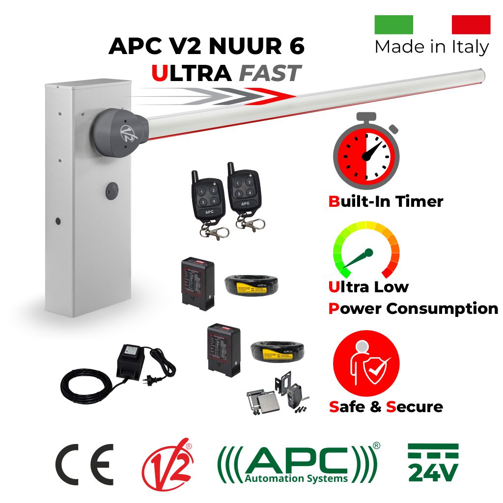Boom Barrier / Boom Gate / Parking Barrier, Car Parking Access Control APC V2 NUUR 6, Universal Boom Gate Ultra High-Speed 24V DC, 6 Meter Barrier Made in Italy