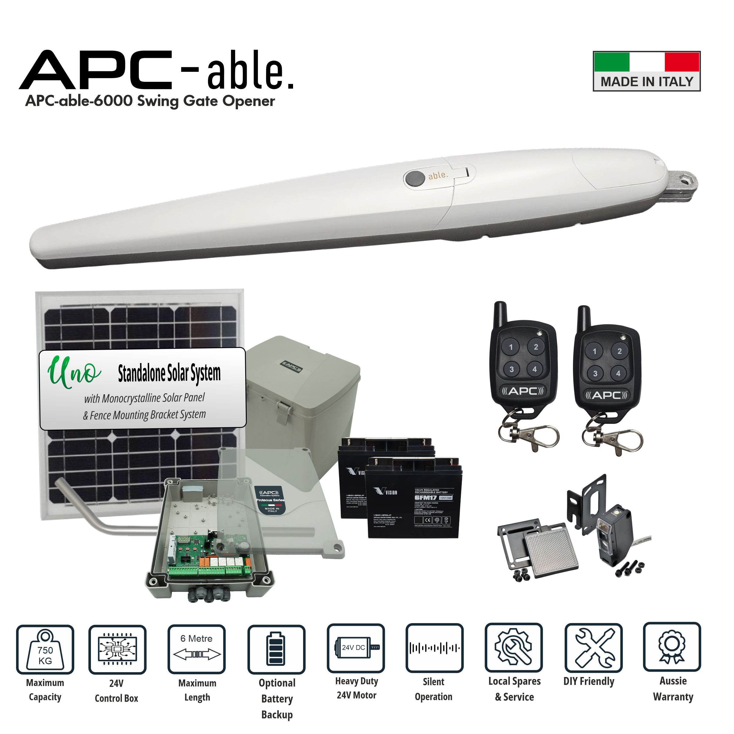 The APC-ABLE-6000 commercial-grade swing gate motor is a rugged, industrial-strength commercial swing gate opener designed to automate large swing gates up to 6 metres per leaf across Australian residential, rural, and commercial installations.