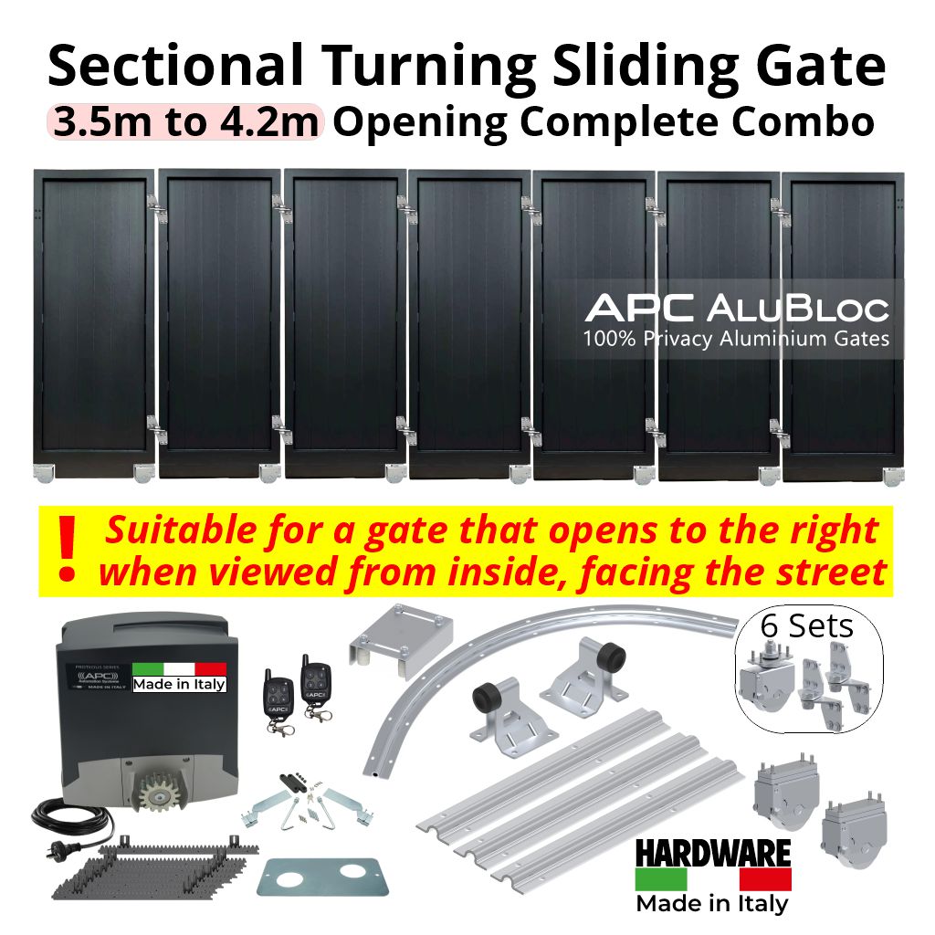 Sectional turning sliding gate kits are specially designed for space-saving (Gate-Panels Follow a Curve Around The Corner). If you need your gate to slide around a corner in a limited space, a turning corner sliding gate hardware set is just what you need.