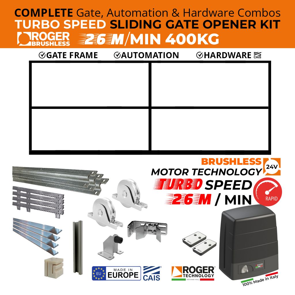A FASTER WAY TO WATCH YOUR GATE MOVE! With the new high-speed line, digital ULTRA HIGH SPEED, it is possible to open and close your gate at very high speed, with maximum elegance and more than doubling the decrease in waiting times of other operators for gate automation. The ideal solution for all installations requiring speedy manoeuvre times, intensive use, maximum movement elegance and total safety during the movement and obstacle detection phases. Faster speeds and shorter waiting times! BRUSHLESS 24V TURBO-SPEED Sliding Gate Automation Motor | with magnetic limit switch The Roger Technology BM30/HS Brushless complete kit includes the sliding gate motor, control panel, and receiver. The BM30/HS motor is a low voltage, super intensive use with native encoder onboard, irreversible ideal for sliding gates up to 400Kg with built-in digital controller B70 series, magnetic limit switch. Includes: - BG30/HS Electromechanical Brushless Sliding Gate Motor See the full details below. A digital brushless motor with a permanent magnetic field and digital electronics for the complete management of the automation system control. Designed for super intensive use with the added benefit of super low energy consumption. Innovative, revolutionary Brushless digital motor with permanent magnetic field, 24V/36V energy sinusoidal with a native encoder that permits highly intensive use of the automation with extremely reduced consumption whilst at the same time fully guaranteeing all its safety and management functions. The new control unit with onboard Brushless digital controller (24V/36V DC). Without traditional relays and thanks to its revolutionary MOSFET quadrant system and its control technology entirely based on a DSP microcontroller, it represents a new generation of electronic cards created to safely handle every type of automation movement. All the mechanical components and gears are manufactured in steel, cast iron and bronze. The automation system casings are made from titanium-reinforced die-cast aluminium. All the gears are inspected and assembled on high-quality bearings and inserted on precise seats machined to provide absolute precision between the axes. Digital, smart, powerful, elegant, robust and all-Italian. A technology that offers maximum performance but consumes less power than other motors. The revolutionary digital motor with 12 unique features. Powerful Digital Brushless Motor A very powerful sliding gate motor with substantial torque. The motor is compact and neat due to the special concentrated coil windings, it is powered by an energy sinusoidal system. Digital & Vectorial Automation Controller The BRUSHLESS digital controller, which operates at low voltage DC, allows 100% control of the automation system in digital mode. Due to its operation entirely based on a DSP microcontroller, the travel and your automation system's movements can be programmed and customised easily, precisely and elegantly. The Digital Silence Of The Motor One great impact is the silence or the near absence of noise generated by the BRUSHLESS motor during all its movements. Motor For Super-Intensive Use The brushless gate motor remains permanently cold even after many days of super-intensive use. Speed, Acceleration & Deceleration With Extreme Elegance The automation system with brushless digital technology creates perfect and elegant movements. With a constant force and torque at every point and the option of varying the speed of deceleration and acceleration, the system can be managed with maximum safety. Extremely Low Energy Consumption A motor that can operate at low voltage in super-intensive use and operate in environments with highly demanding weather conditions while maintaining very low energy consumption and absorption levels. Impact, Obstacle Detection & Reversal In Total Safety Thanks to digital technology, we are able to detect an obstacle and reverse the motor instantly by simply specifying the torque of the motor, the sensitivity, the time and the travel of the reversal, all in full compliance with safety requirements. Onboard Native Digital Encoder The BRUSHLESS motor has a highly advanced native digital encoder that controls the management of automation systems in a safe, precise and extremely elegant manner. No Problem In The Event Of Power Failure With the help of internal or external batteries and the associated battery charging card, your automation system continues to operate considerably even during prolonged power cuts, ensuring many more operations than traditional technologies. Motor At Ambient Temperature The brushless motor was created with the main goal of being a motor for super intensive use and with a 99% efficiency. Regardless of how many operations the engine performs in a day, it always remains cold or, at the most, reaches the outside ambient temperature. Simple Installation With A Single 3-Wire Cable And the BRUSHLESS motor can be installed by simply connecting it using a single 3-wire cable! What could be easier? This will provide fully digital management of your automation system thanks to sensorless or sensored technology, depending on the type of automation system. Advanced Precision Engineering To Obtain Optimal Motor Performance We have created a mechanism that gives you the opportunity to get the maximum performance out of the motor. A product that combines the quality of the internal production processes, mechanical processing, and high-quality ferrous and non-ferrous materials. Fix code transmitter 433,92 Mhz. 2 channels, with radio for copy. Technical features Fixing plate with stay bolts and screws M30 series. Kit magnetic limit switch for the control units H70/103AC, H70/104AC, B70/1DC, and B70/1DCHP. Raised fixing plate for M30 series (+3 cm). Italian Made BRUSHLESS Gate Motor, TURBO-SPEED (44 cm/s) Sliding Gate Opener.
