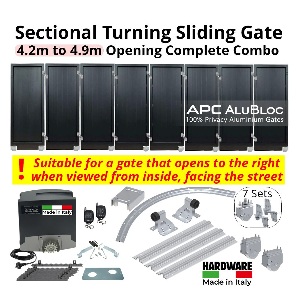 Sectional turning sliding gate kits are specially designed for space-saving (Gate-Panels Follow a Curve Around The Corner). If you need your gate to slide around a corner in a limited space, a turning corner sliding gate hardware set is just what you need.
