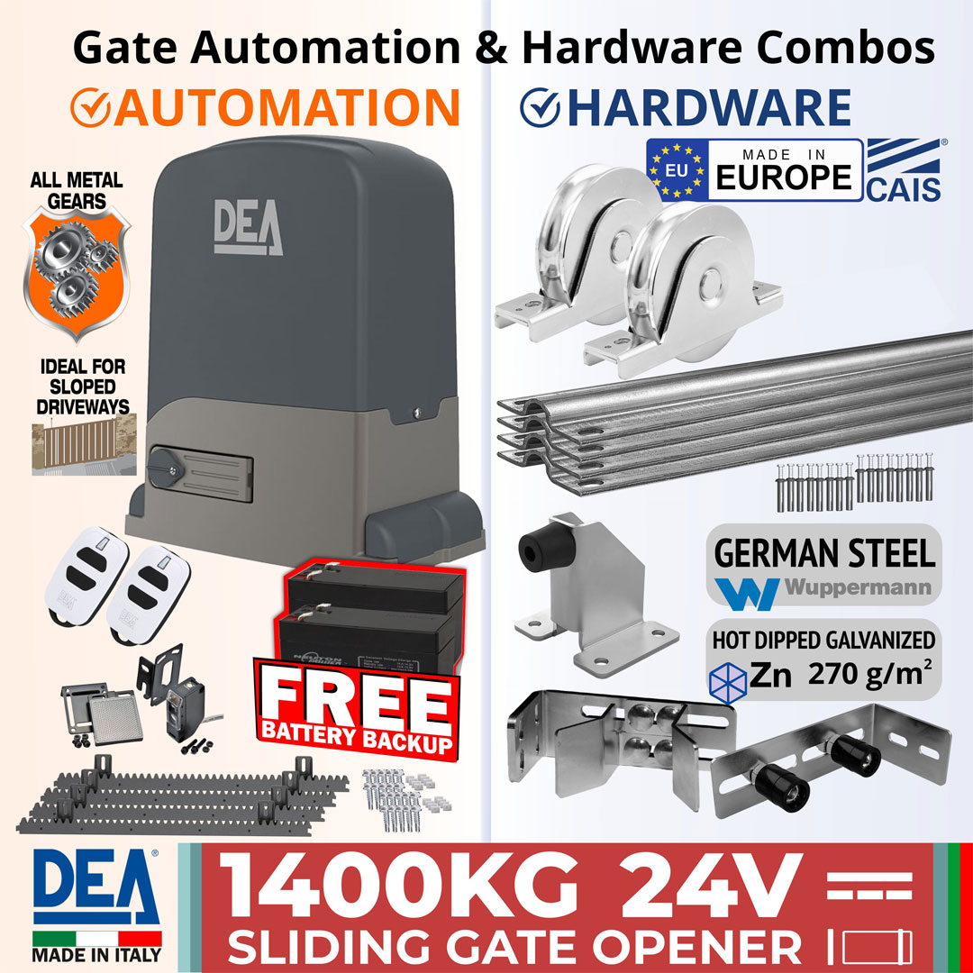 Complete Sliding Gate Opener and Hardware Kit, |10m / 1400kg Capacity Sliding Gate Motor | Italian Made by DEA