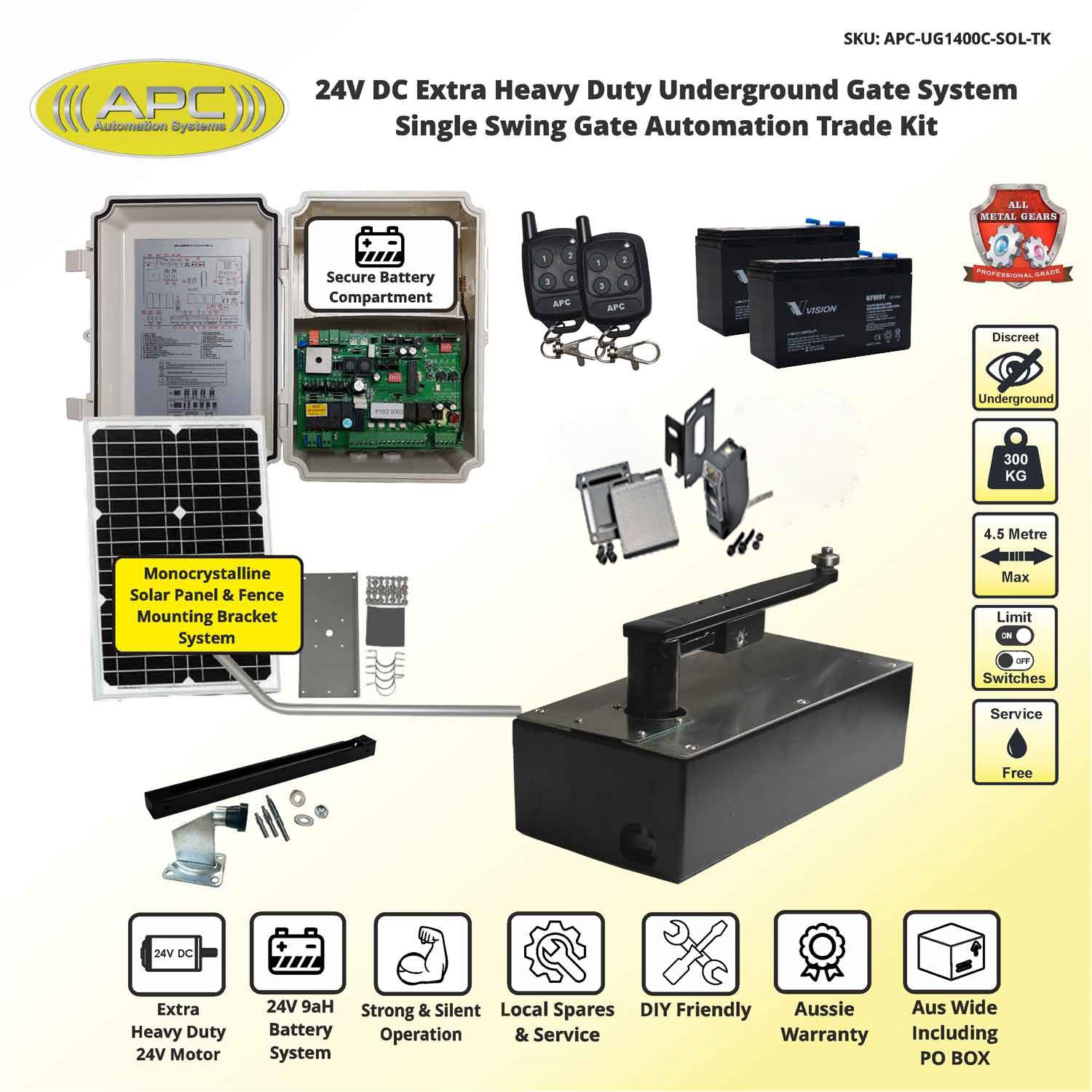 Order the APC UG1400C underground swing gate motor from Automotion Plus and enjoy fast Australia-wide shipping to Sydney, Melbourne, Brisbane, Adelaide, Perth and regional areas.