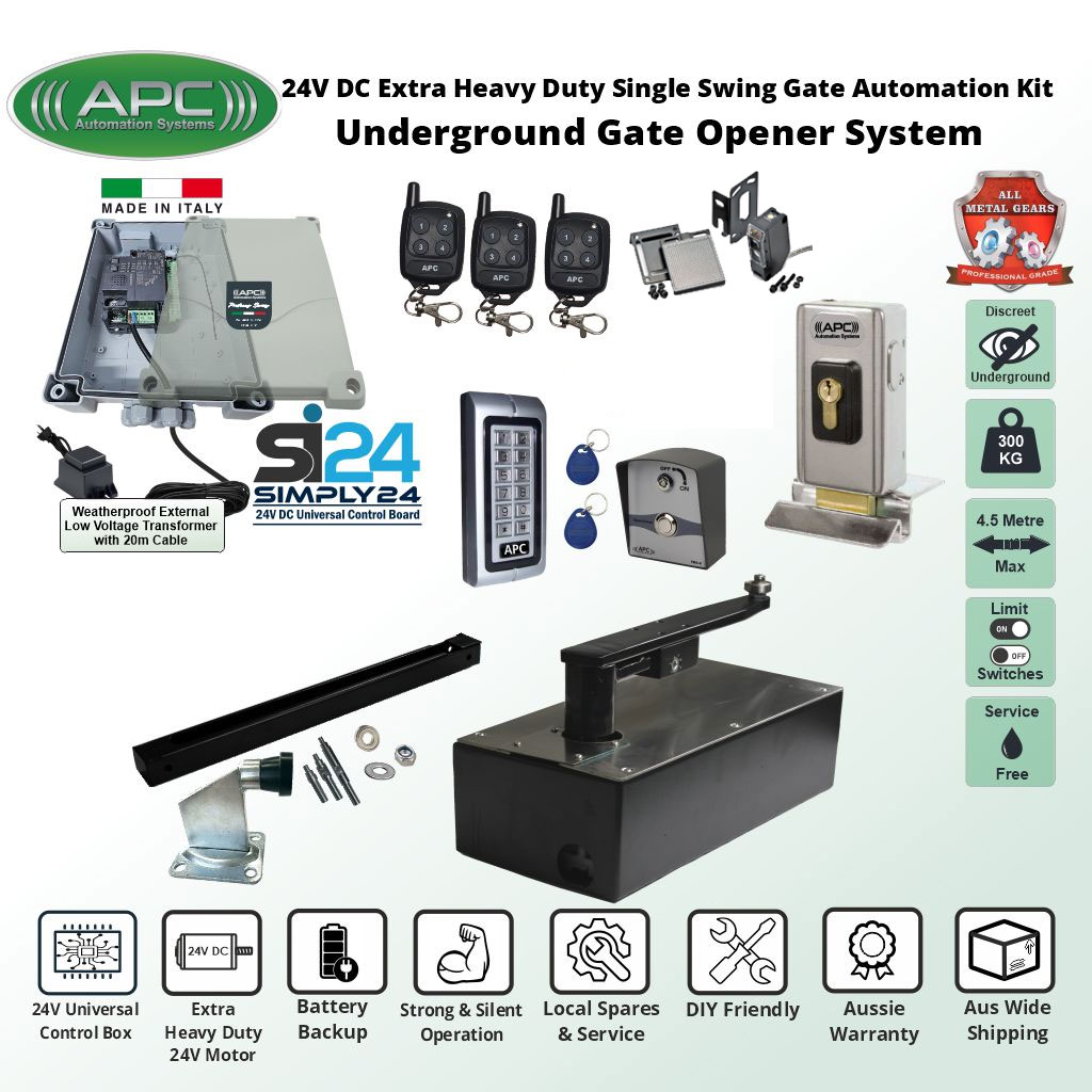The APC UG1400C underground swing gate motor is a premium 24V DC single-swing gate opener system designed for Australian residential and light-commercial properties. Installed discreetly below ground at the gate hinge, this system delivers smooth, secure and virtually invisible swing gate automation.