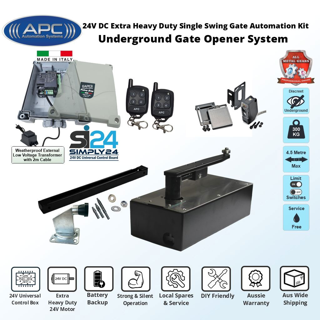 The APC UG1400C underground swing gate motor is a premium 24V DC single-swing gate opener system designed for Australian residential and light-commercial properties. Installed discreetly below ground at the gate hinge, this system delivers smooth, secure and virtually invisible swing gate automation.