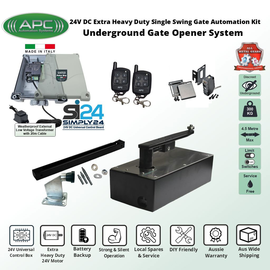 The APC UG1400C underground swing gate motor is a premium 24V DC single-swing gate opener system designed for Australian residential and light-commercial properties. Installed discreetly below ground at the gate hinge, this system delivers smooth, secure and virtually invisible swing gate automation.