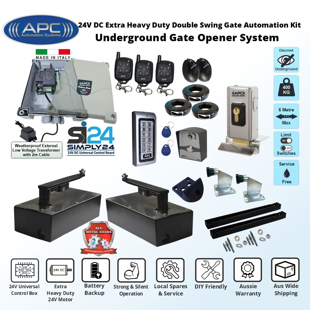 DIY Gate Opener Super Secure Kit Discreet Underground Automatic Gate System with Italian-Made Simply 24 Universal Control Box, APC-UG2400C Extra Heavy Duty All Metal Gears Underground Gate Motor, Adjustable Limit Switches, Safety Sensor, Electric Gate Lock, Keypad with EM card Reader, Push Button Switch, Remote Controls, Double Swing Gate Automation