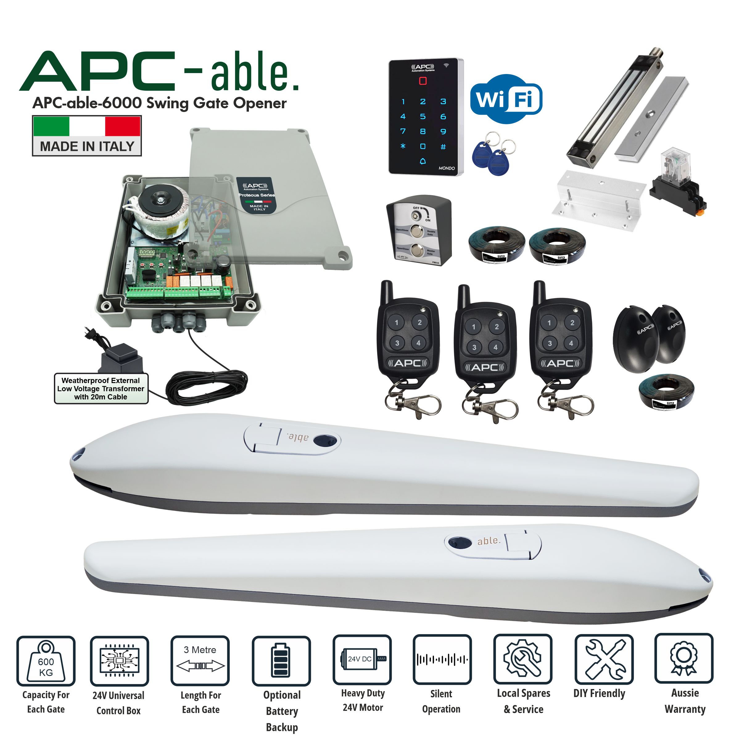 24V Automatic Double Swing Gate Motor. "APC Able 6000" Electromechanical actuator for swing gates with each leaf up to 3m in length (for each gate).