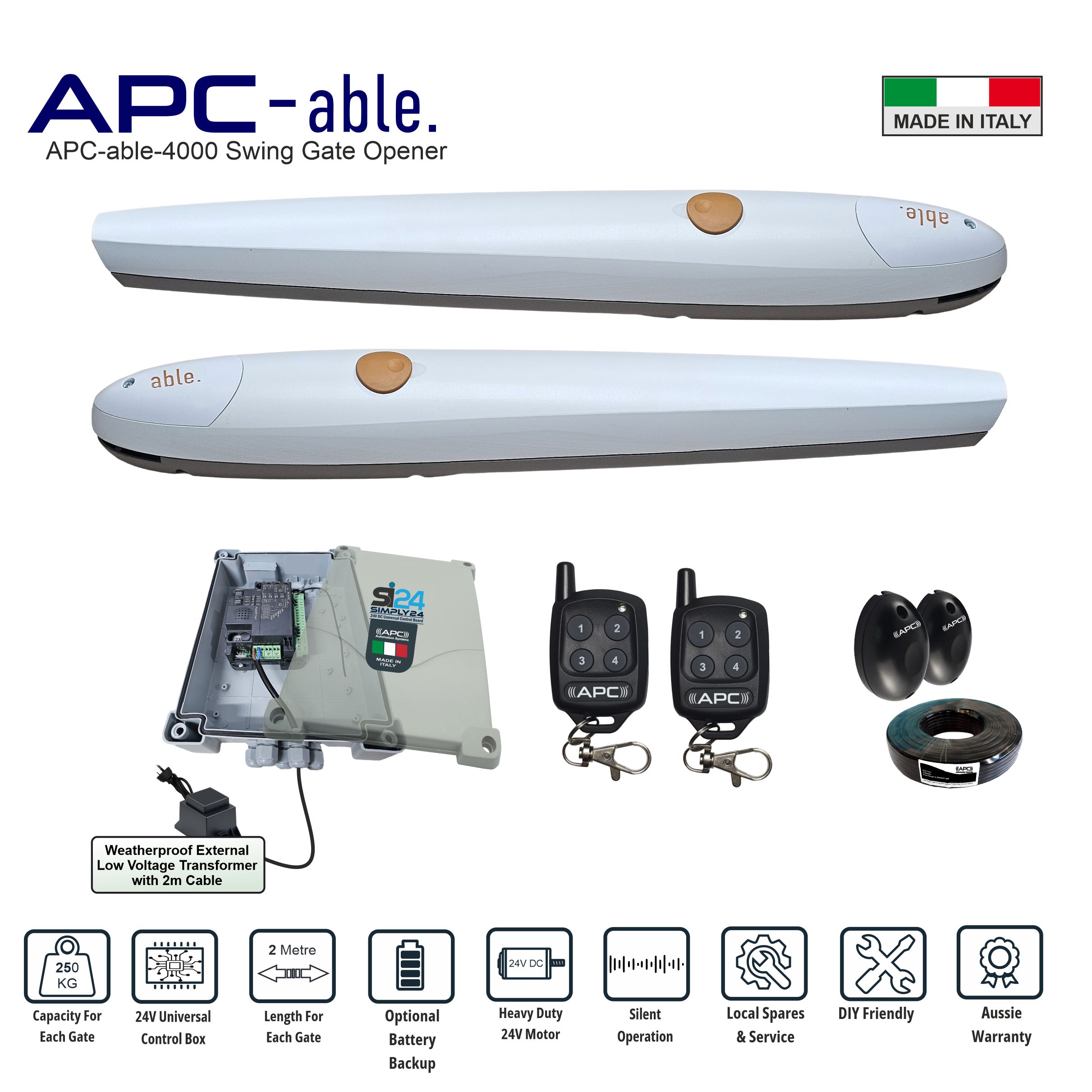Italian-made 24V Automatic Double Swing Gate Motor. "APC Able 4000" Electromechanical actuator for swing gates with each leaf up to 2m in length (for each gate).