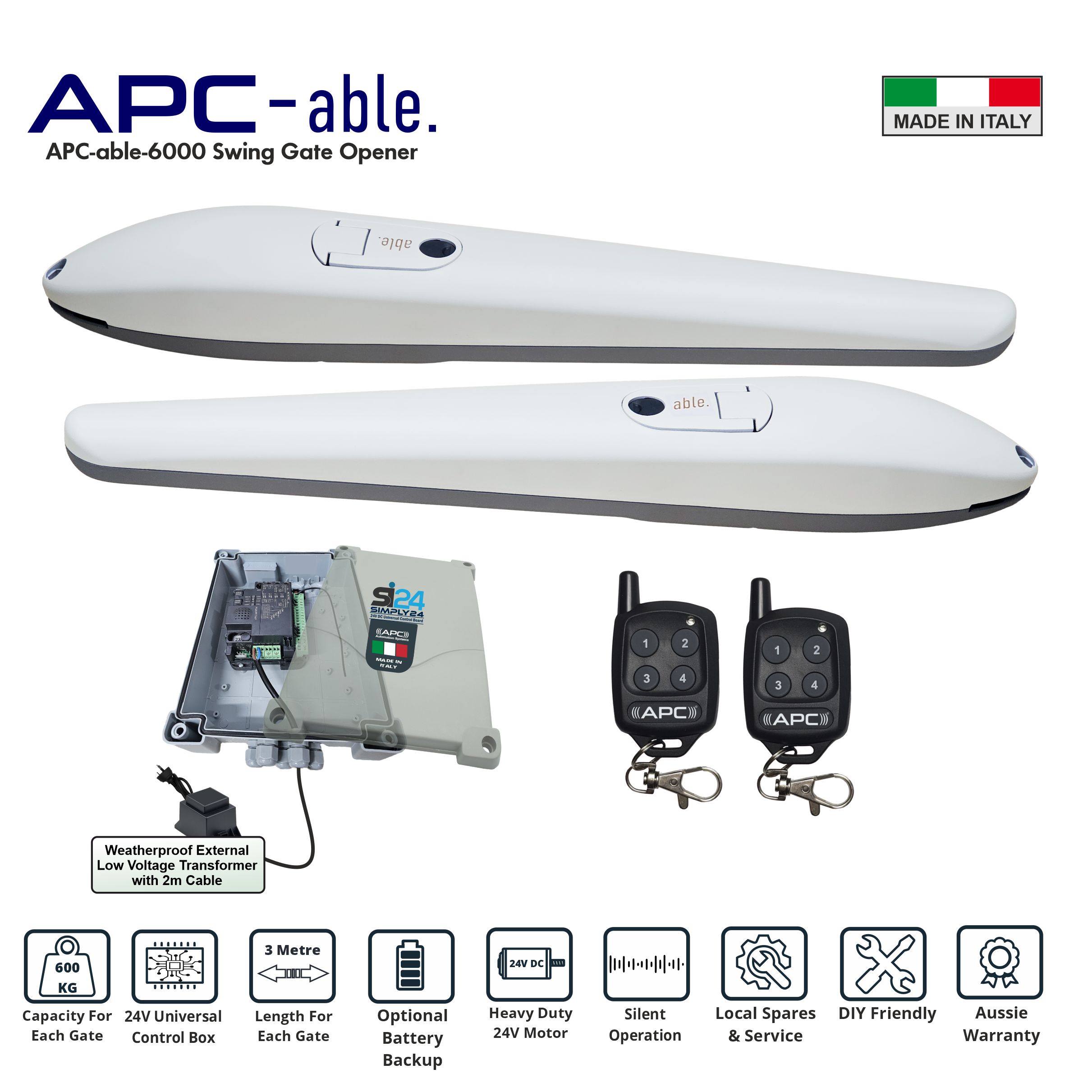 24V Automatic Double Swing Gate Motor. "APC Able 6000" Electromechanical actuator for swing gates with each leaf up to 3m in length (for each gate).