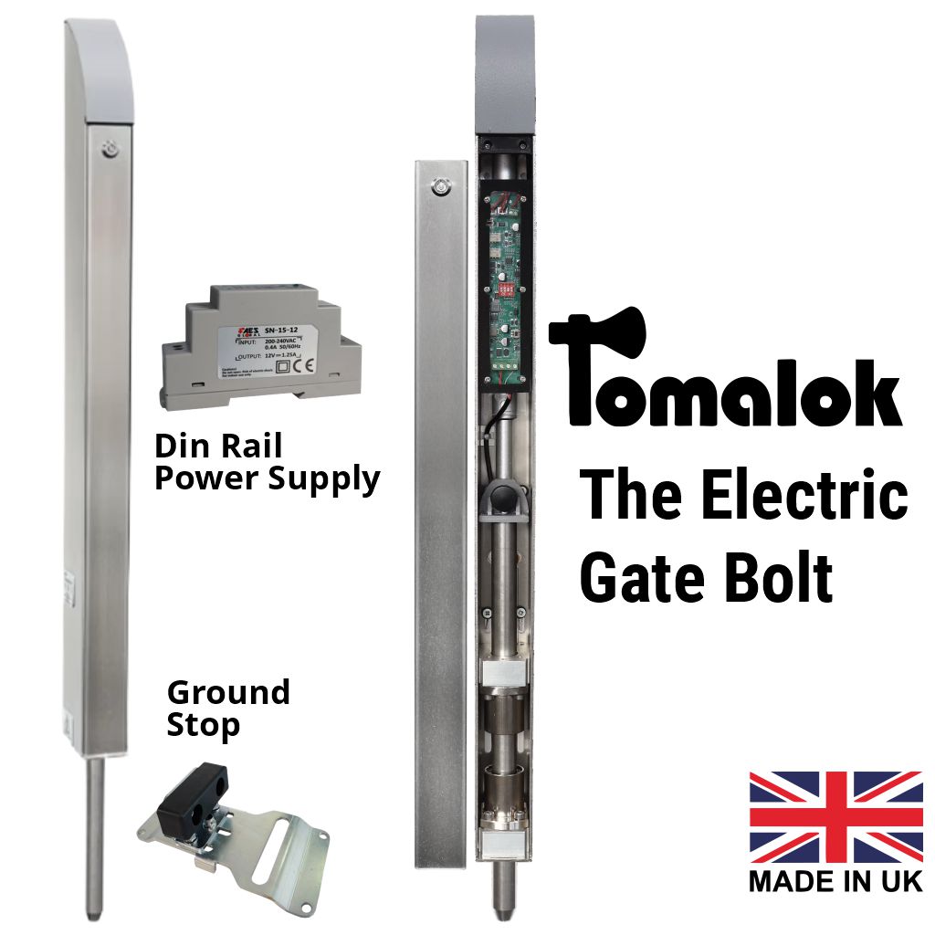 The Tomalok is an advanced, durable electric gate lock that increases the security of any property entrance. This is the 24V DC Tomalok in a Stainless-Steel finish with a 150 mm bolt, supplied with a DIN rail-mounted 24V power supply and group stop. The sleek design offers a discreet yet powerful safeguard.