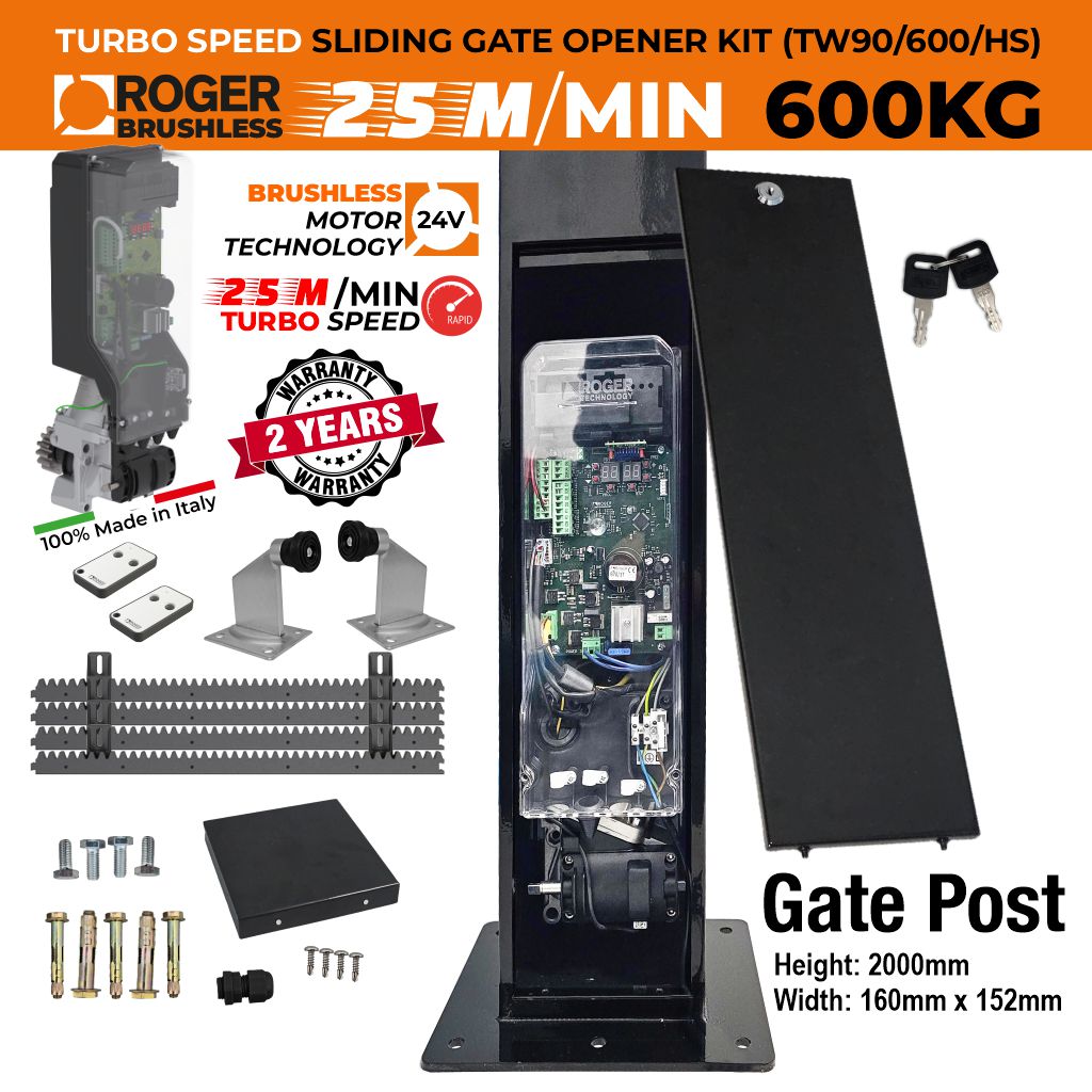 The Roger Technology TW90/600/HS Brushless complete kit includes the "In-Post Invisible" roller sliding gate motor, control panel, and receiver.