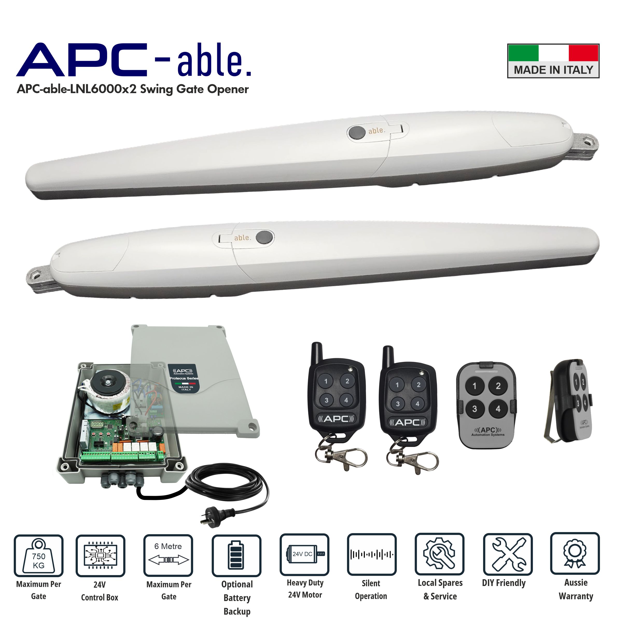 The APC-ABLE-6000x2 commercial-grade swing gate motor is a rugged, industrial-strength commercial swing gate opener designed to automate large swing gates up to 6 metres per leaf across Australian residential, rural, and commercial installations.