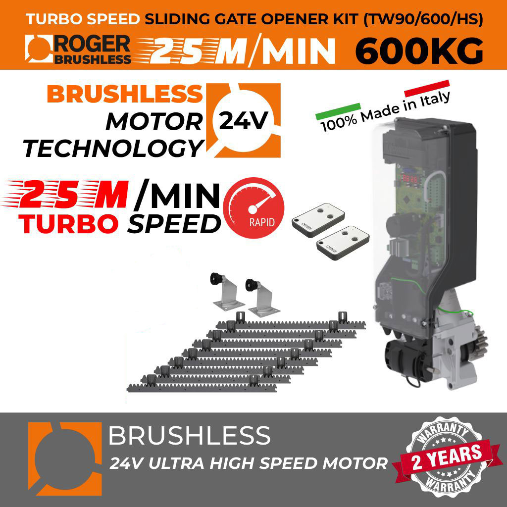 The Roger Technology TW90/600/HS Brushless complete kit includes the "In-Post Invisible" roller sliding gate motor, control panel, and receiver.