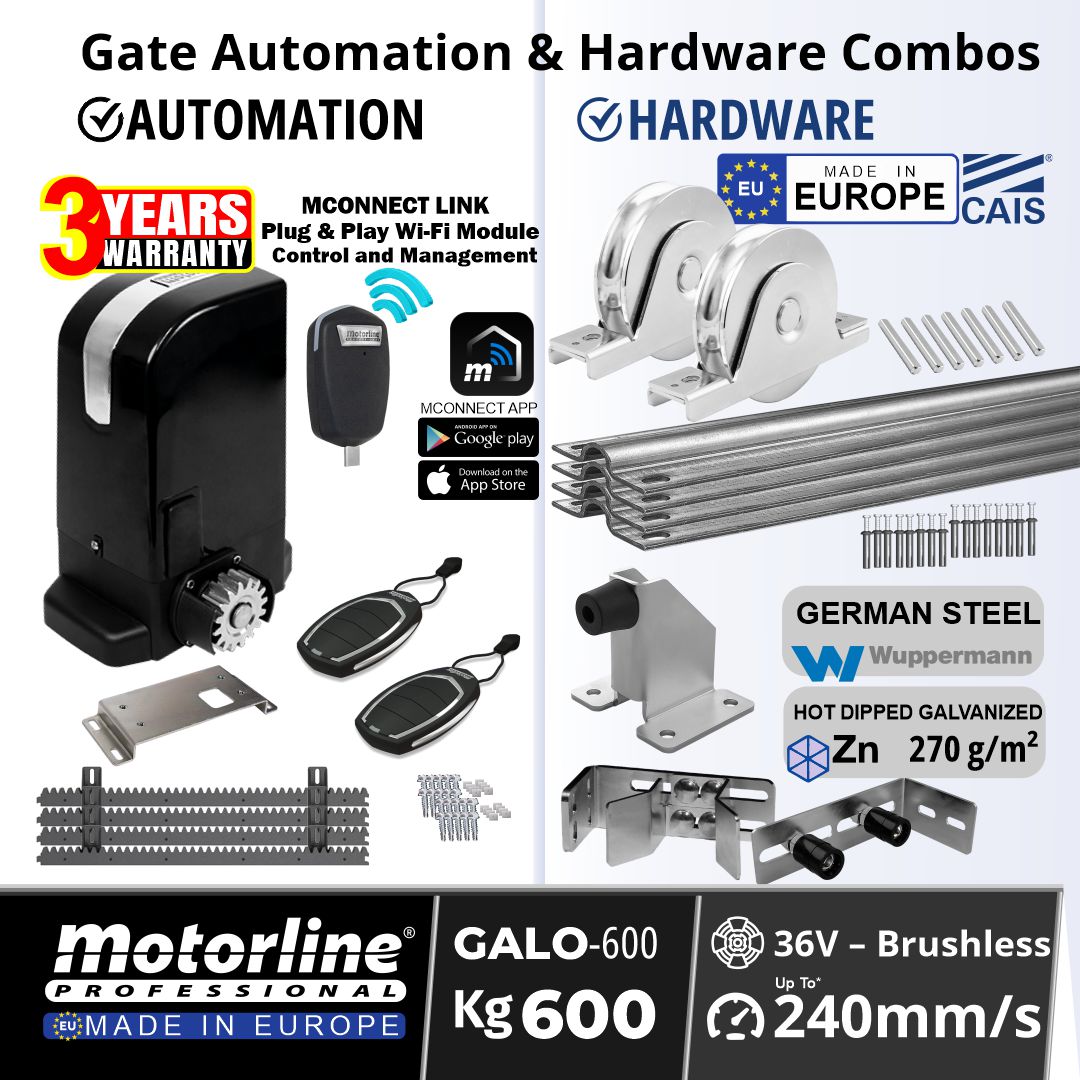 Motorline GALO600 Sliding Gate Automation System with 36V Brushless Sliding Gate Motor up to 600kg. The European-made Sliding Gate Opener features smooth, quiet operation, advanced obstacle detection, magnetic limits and an encoder-controlled sliding gate.