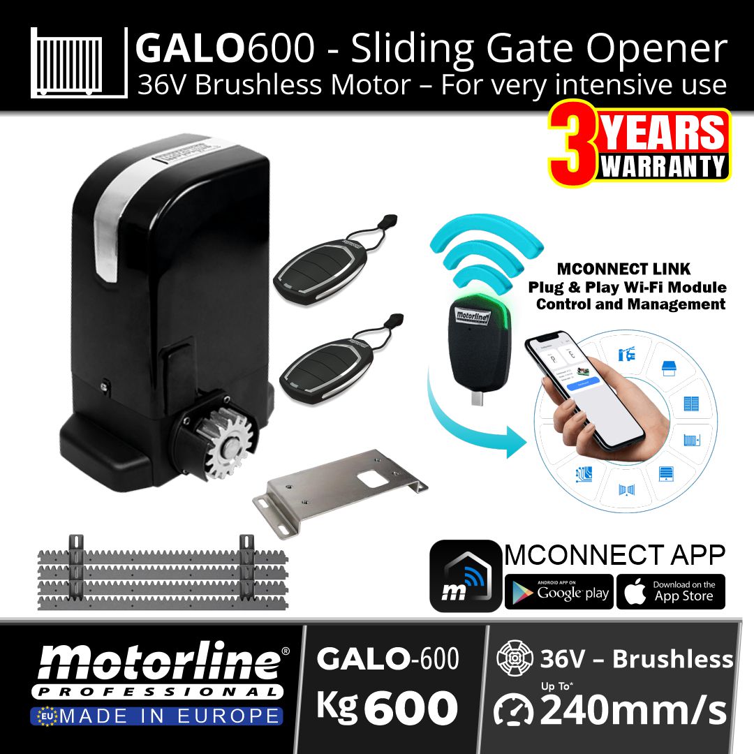 The Motorline GALO600 Sliding Gate Opener is a high-performance 36V brushless sliding gate motor designed for intensive residential and light commercial applications.