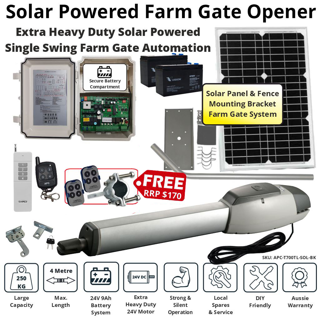 This Solar Electric Farm Gate Opener Kit Comes with TWO FREE Sunvisor Remote Control and Farm Gate Bracket(RRP$170)