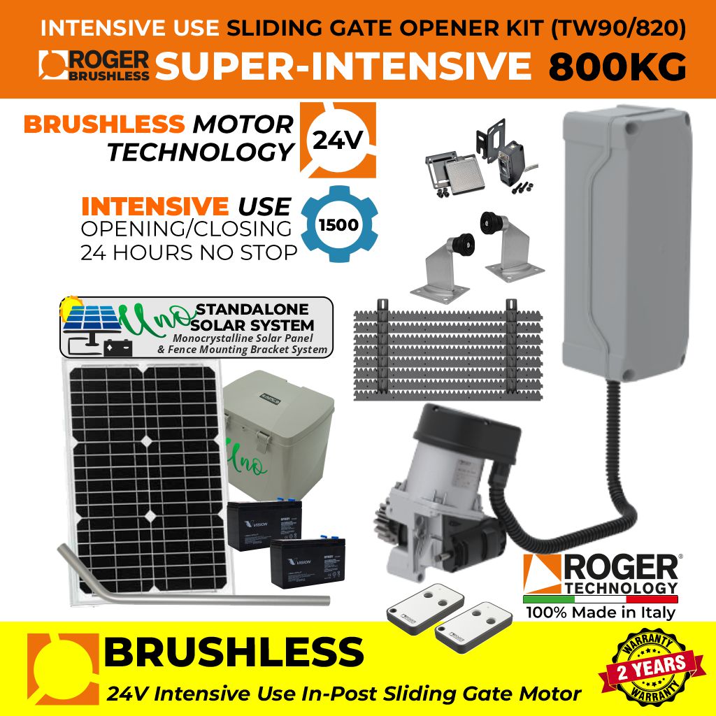 The Roger Technology TW90/820 Brushless complete kit includes the "In-Post Invisible" roller sliding gate motor, control panel, and receiver.