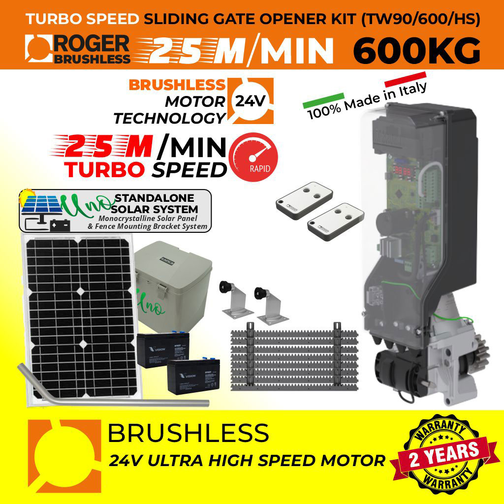 The Roger Technology TW90/600/HS Brushless complete kit includes the "In-Post Invisible" roller sliding gate motor, control panel, and receiver.
