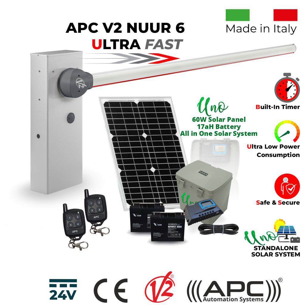 Control vehicle access with the APC V2 NUUR. Italian-made, 24V ultra-fast boom gate (4m/6m). Features obstacle detection, solar readiness & smartphone control.
