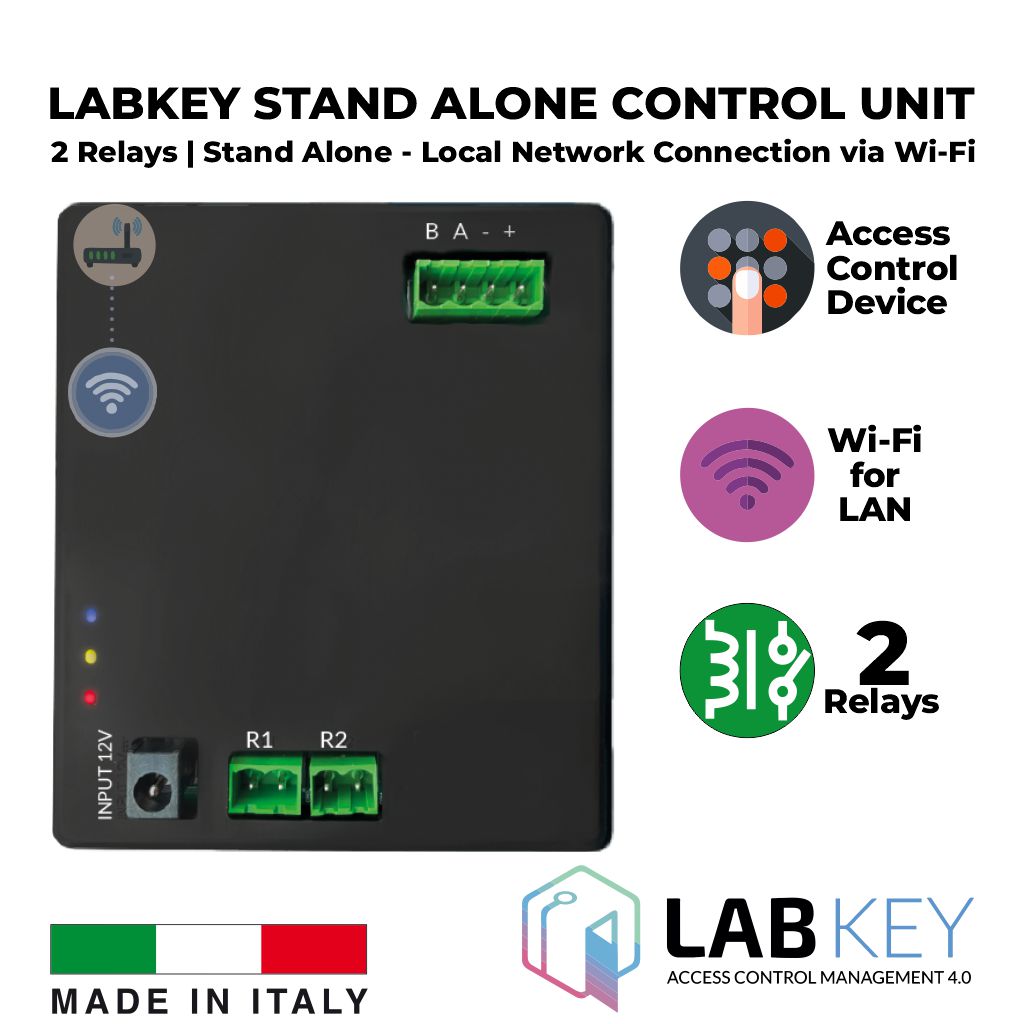 LK-BS-CU2: LabKey Stand-alone Control Unit with two relays, capable of pairing with up to 4 control devices and managing up to 2 access points, with network connection via Wi-Fi.