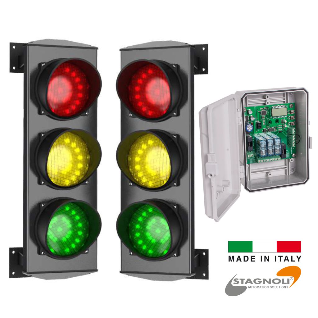Control board for 2 traffic lights with 2 or 3 lights. Specially designed for alternating one-way roads in apartment buildings (e.g. ramps), company and car park contexts. The ACNSEM3L universal electronic control unit has been a solution for managing two or three traffic lights with two or three lenses in situations where access driveways are narrow and require alternate transit (garage, parking, residence, etc.).