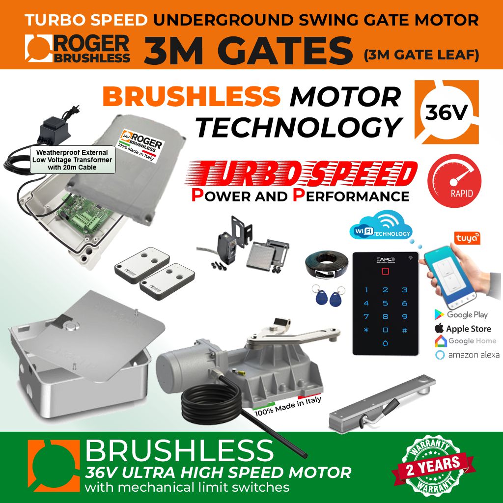 Electromechanical underground motor, HIGH-SPEED BRUSHLESS, low voltage, super intensive use, with native encoder onboard, ideal for swing gates with leaf up to 3m. Standard version with 2m cable.