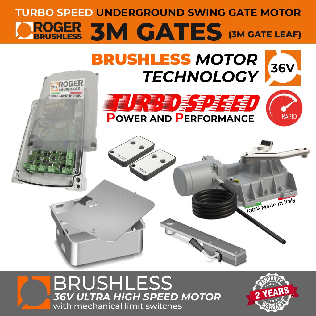Electromechanical underground motor, HIGH-SPEED BRUSHLESS, low voltage, super intensive use, with native encoder onboard, ideal for swing gates with leaf up to 3m. Standard version with 2m cable.