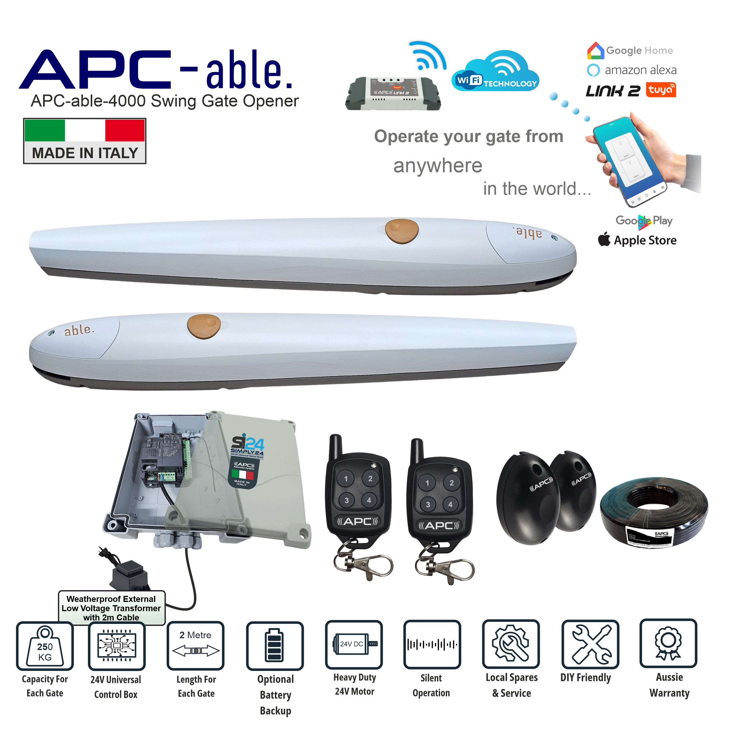 Italian-made 24V Automatic Double Swing Gate Motor. "APC Able 4000" Electromechanical actuator for swing gates with each leaf up to 2m in length (for each gate).