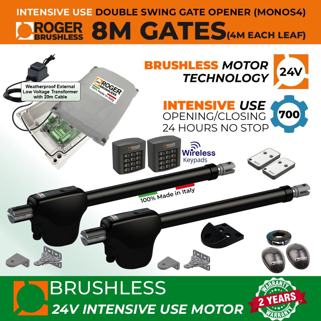 Roger Technology 24V Super Intensive Use Brushless Gate Automotion LV System | Max. 8m Opening (4M or 450KG Each Leaf)