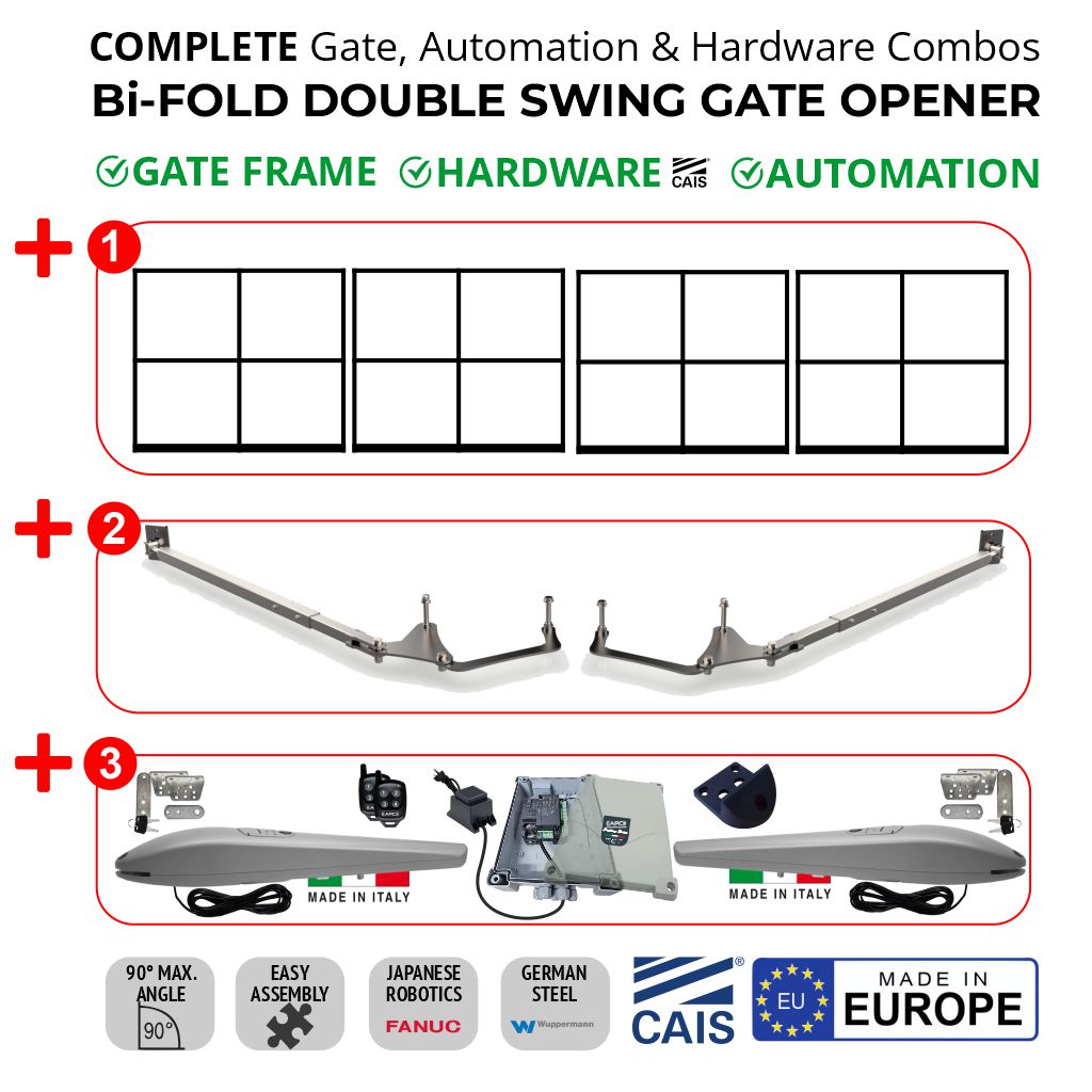 They need a special frame, so a few factors need to be considered, such as cross-bracing. The reason why cross-bracing is fundamental is primarily to keep the leaf from sagging. A compression cross-brace transfers weight from the top bar by pushing down against the bottom hinge or a vertical component or post, which transfers the load to both hinges. Improper or missing cross-bracing will cause the Vertical deflection of the leaf. Cross-bracing should always “lean into opening”. Furthermore, the bi-folding swing gate only works properly when the internal hinges are properly welded concerning the vertical axle. You‘ll also need to consider the wiring of safety edges, as this feature should be accommodated in the frame.