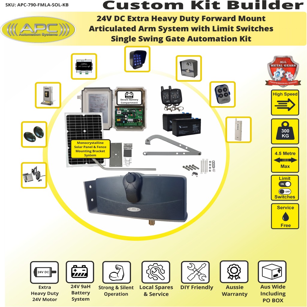 Upgrade your gate with the APC-790 Articulated Swing Gate Opener. Australian-designed for wide pillars and heavy farm gates. Features all-metal gears, a 24V DC motor, and easy forward-mount installation. Shop now for fast AU delivery.