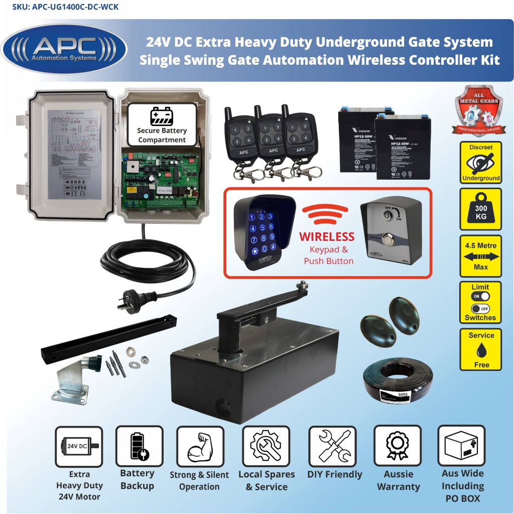 Service Gate Function (12V 250mA max.). Using the second lock output will allow the user to power and control a second electric striker installed on a pedestrian access gate the second lock is powered from the control panel and controlled using button 4 on the remote. APC Wired and wireless Accessories can also be use to control the Lock 2 function.