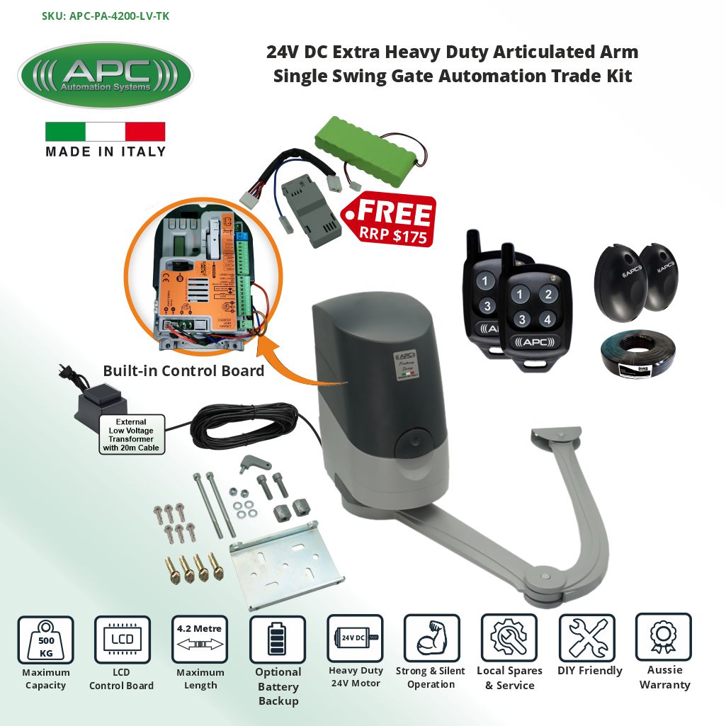 Single Swing Gate Opener 24V System, 4.2 Meter, 500KG, Adjustable Built In Stop