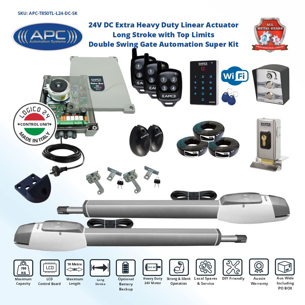 Extra Heavy Duty 24V Motor with powerful and quiet operation. Robust all-metal internal gears, sleek European design with a compact and neat appearance Easy to use manual override via the supplied keys in an emergency situation. The system can handle light and heavy gates up to 350kg maximum weight for each gate leaf or up to 5m maximum length of each gate leaf.