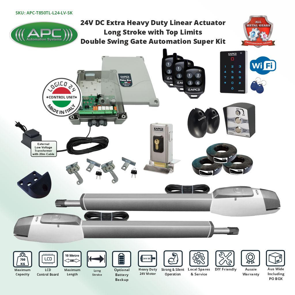 Extra Heavy Duty 24V Motor with powerful and quiet operation. Robust all-metal internal gears, sleek European design with a compact and neat appearance Easy to use manual override via the supplied keys in an emergency situation. The system can handle light and heavy gates up to 350kg maximum weight for each gate leaf or up to 5m maximum length of each gate leaf.
