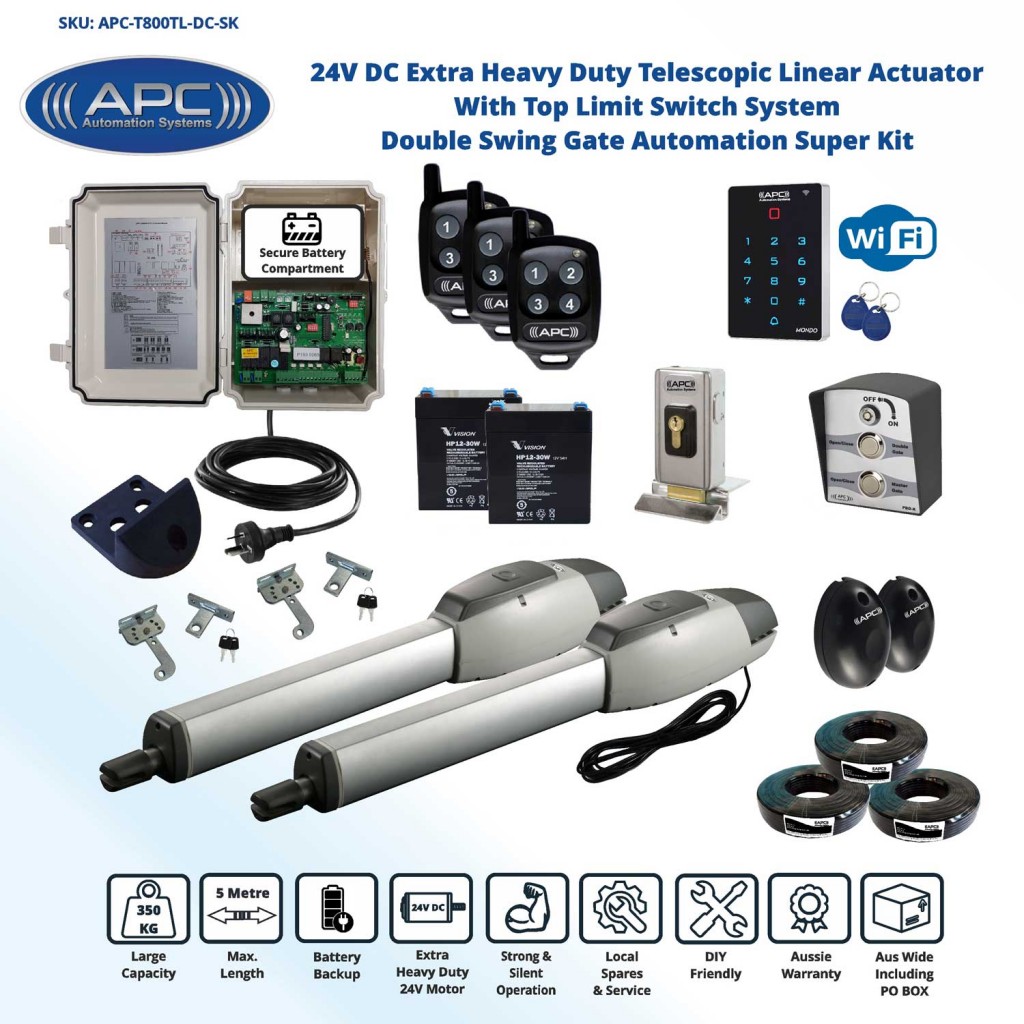 Heavy Duty 24V Motor with powerful and quiet operation Sleek European design with a compact and neat appearance Easy to use manual override via the supplied keys in a emergency situation. The system can handle light and heavy gates up to 175kg maximum weight each or up to 2.5m maximum length each.