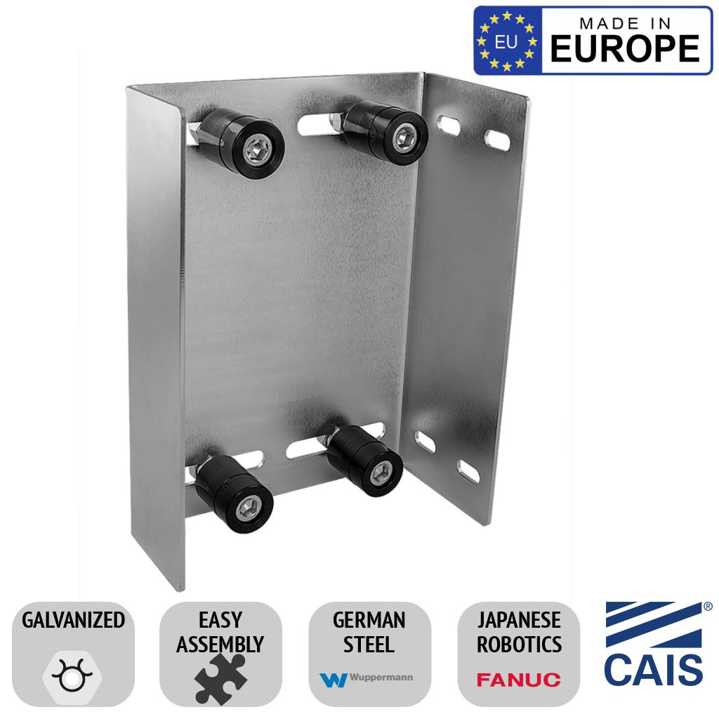Four Rollers & Bracket. Suitable as a guiding system for manual or automatic sliding gates. The bracket supplied can be mounted on walls, pillars, posts, and other supports to withstand the load.