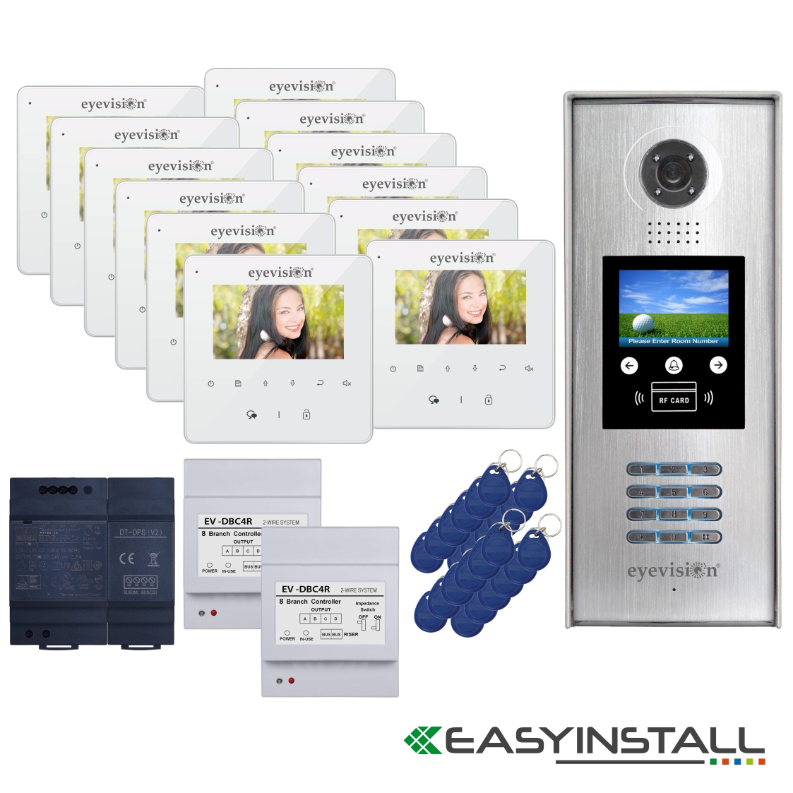 12 Apartment Intercom EasyInstall 2 Wire System Complete Package, Includes 24 RFID Swipe Tags